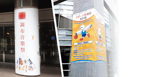 庁舎や多目的ホール・駅の構内といった、公共施設にある大きな柱に印刷メディアを巻きつけるので、立体的で見栄えもバツグンです。