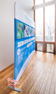 本体のパイプを組んだところに袋状に加工した印刷メディアを上からかぶせて設置するので、側面の厚み(奥行)が約4cmと非常に薄型なところが最大の特徴です。